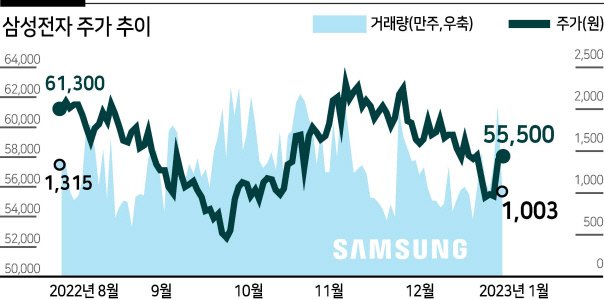 삼성전자의 주가는 과거 몇 년간 큰 변동성을 보였습니다. 2022년 8월부터 2023년 1월까지의 주가 흐름을 살펴보면, 주가는 61,300원의 최고가와 1,003원의 최저가를 기록하며 큰 폭의 변동을 보였습니다. 이러한 변동은 글로벌 경제의 불확실성과 반도체 시장의 수요 변화에 기인한 것으로 분석됩니다.