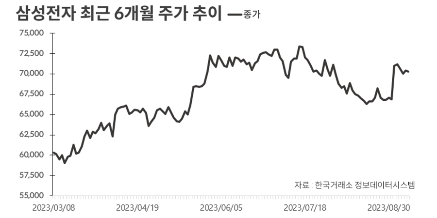 또한, 2023년 3월부터 8월까지의 주가 흐름을 살펴보면, 주가는 55,000원에서 75,000원 사이에서 변동하며 전반적으로 상승세를 보였습니다. 이 시기에는 반도체 수요가 회복세를 보이면서 주가가 상승하는 모습을 확인할 수 있었습니다.